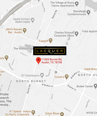 LACQUER North is located at 11005 Burnet Rd & Kramer, across the street from The Domain Northside. LACQUER is in-between bex+Co hair salon and Summer Moon coffee.